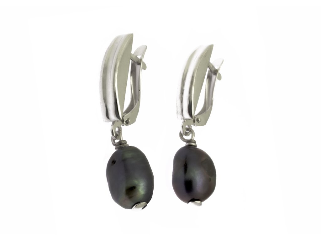 Zajímavé visací náušnice zdobené tmavou perlou. Zapínání je francouzské. Náušnice jsou rhodiované. K objednávce dárková krabička zdarma.